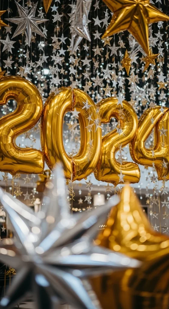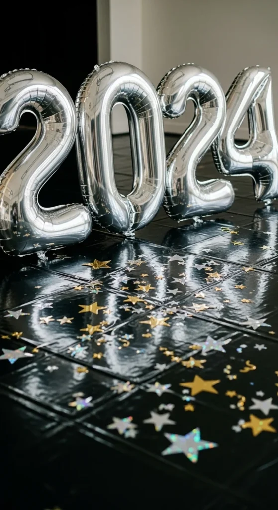 Use silver balloon numbers to create a quick wall display. The reflective surface works well with white or neutral walls. Attach them using removable hooks or painter’s tape so no marks remain. Add a few small star balloons around the numbers for light texture.