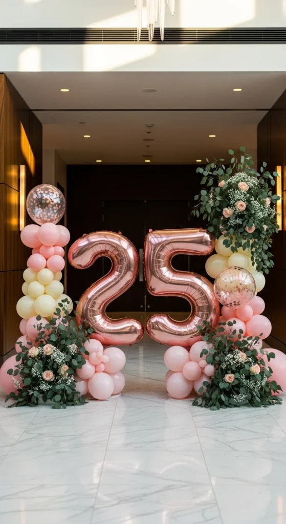 Make your entryway memorable with a rose-gold balloon arch featuring oversized numbers. Position the numbers on either side of your doorway. Fill the arch with small balloons in matching tones to frame the entrance.