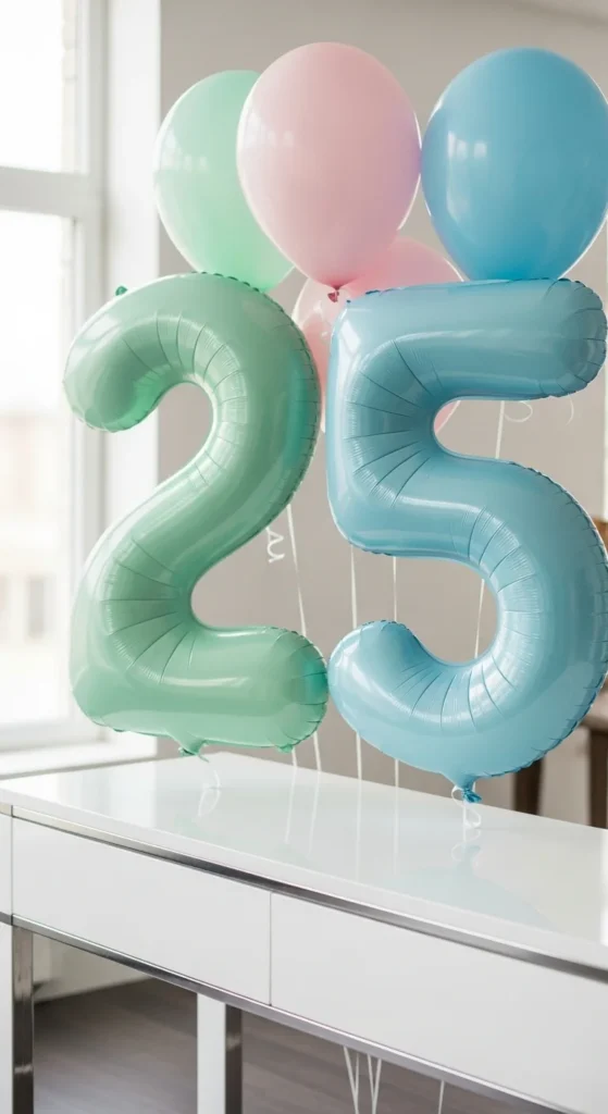 Use small pedestals or stools to lift balloon numbers off the floor. This simple height change creates a stronger visual impact. Choose pedestals in neutral colors so the balloons stay the focus.
