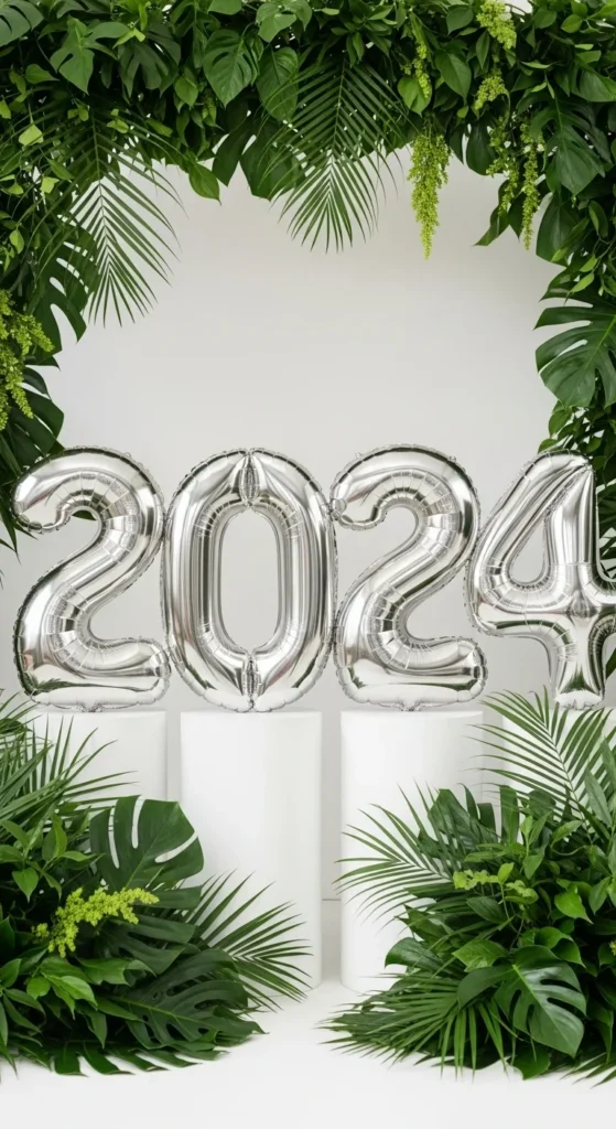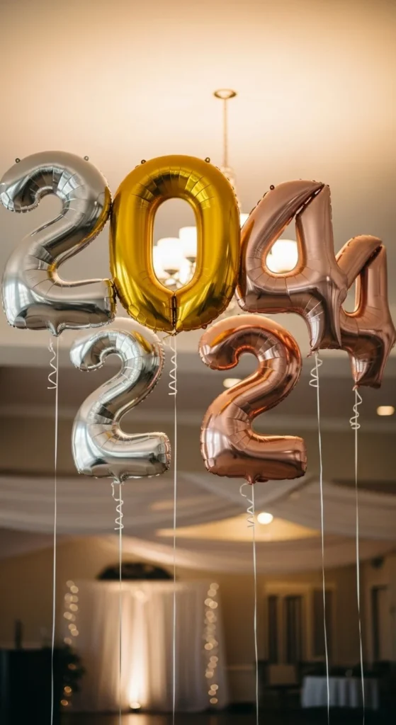 Try pastel balloon numbers for a softer atmosphere. Mix pale pinks, mints, and baby blues for a calm New Year style that works well in family gatherings or minimal rooms. Place the balloons near a console table with neutral accents.