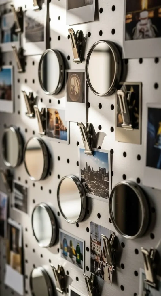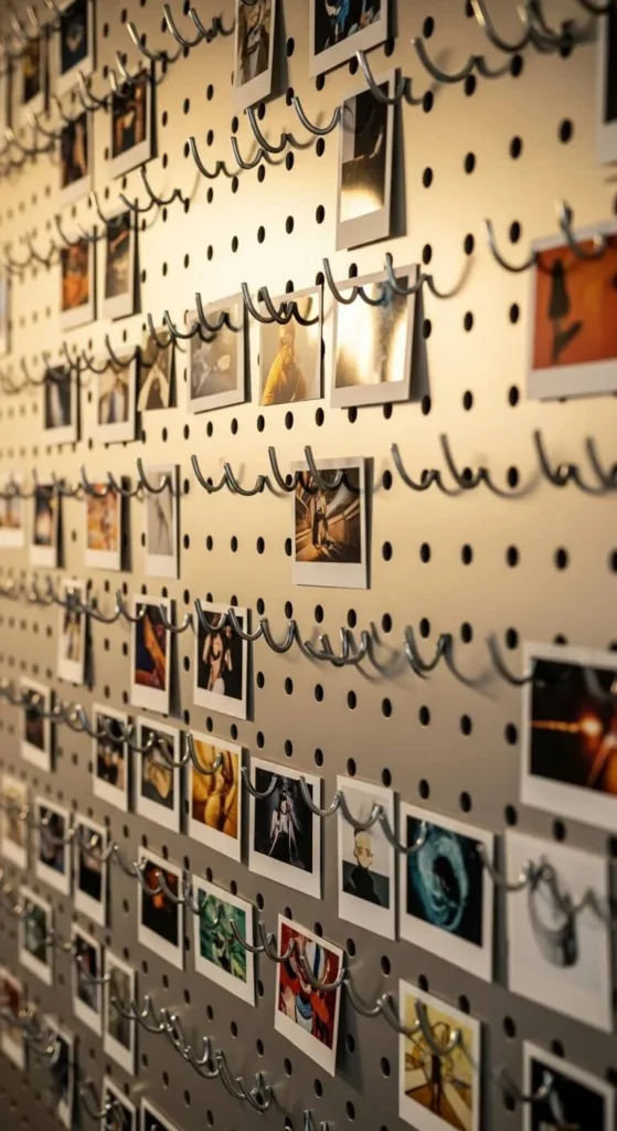 Create a shadow-box look by adding a wide silver frame around the pegboard. This helps the display feel structured. Add LED strips behind the frame for a soft outline. Clip photos evenly inside the frame. If you’re on a budget, paint a wooden frame silver. Keep the decor minimal so the framed effect stands out.