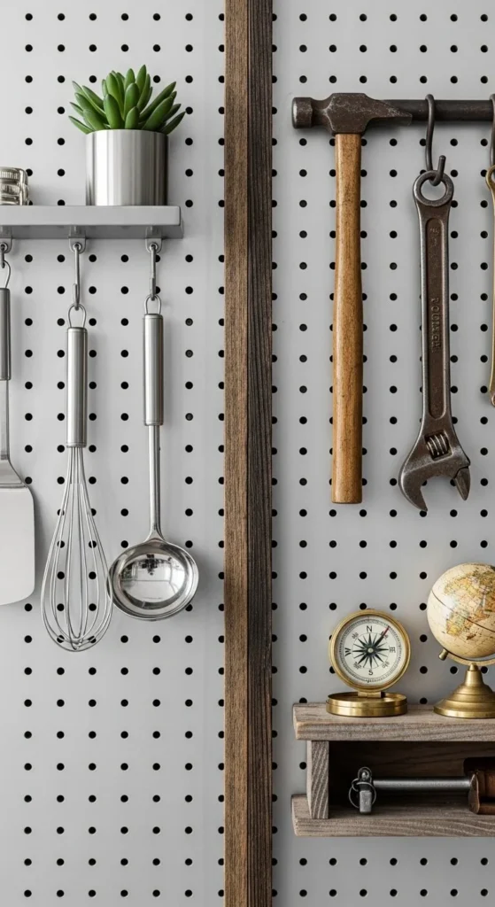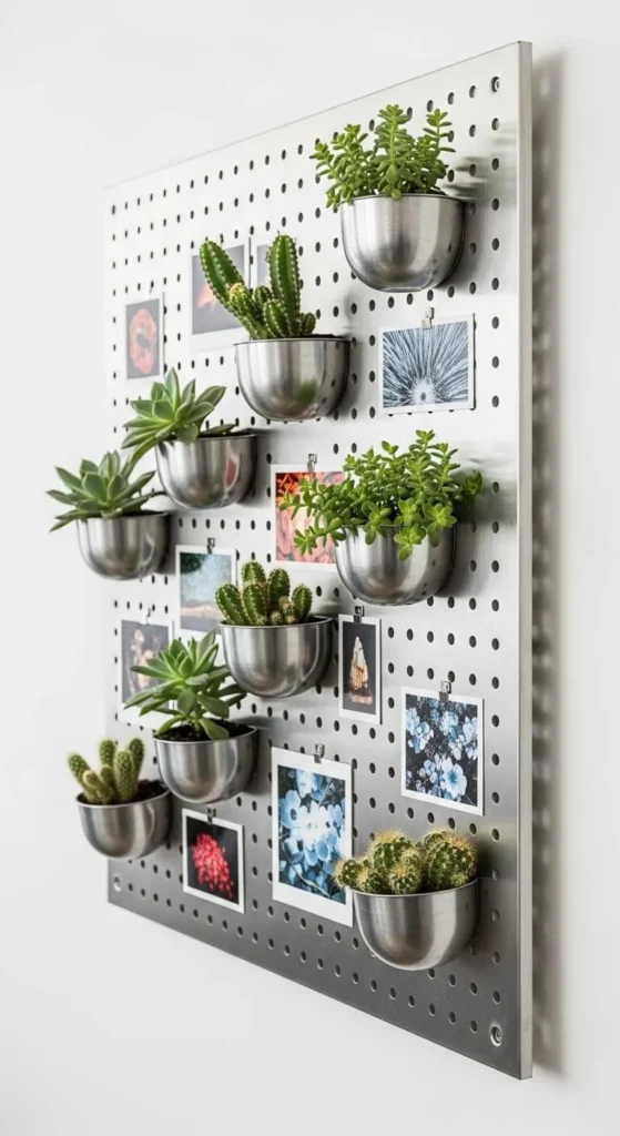 Hang tiny silver pots with faux plants on the pegboard. Place photos between the plant pots to create a lively layout. Keep the plant sizes small so they don’t overshadow images. Use lightweight pots to avoid strain. Add a single LED clip light near the top to brighten the greenery. This setup softens the metallic background.