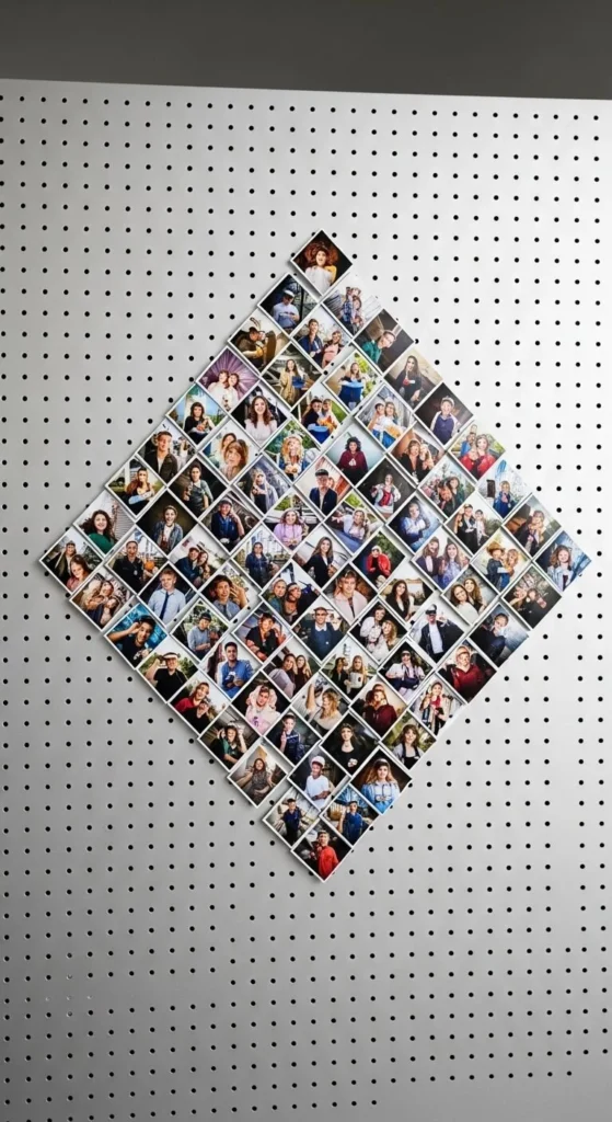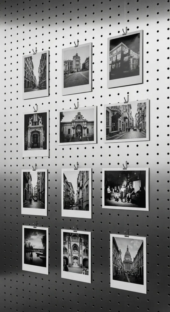 Place one oversized feature photo at the center. Surround it with smaller prints to form a frame. Use matching silver or chrome clips for consistency. Add thin pegboard borders using silver tape to create a focal point. If you want to personalize it, add a small handwritten tag under the main photo. This layout is simple and feels clean for tight spaces.
