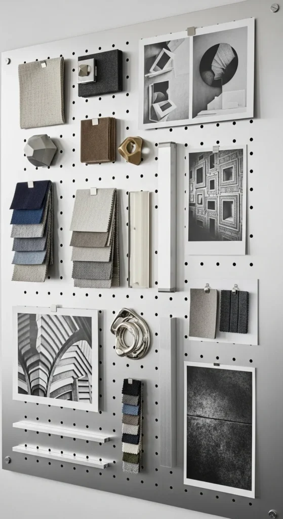 Divide the pegboard visually into geometric shapes—triangles, diamonds, or diagonal sections. Use silver washi tape to mark boundaries without damaging the board. Place photos inside each section to create a structured layout. Add simple pegboard baskets for tiny props like glitter or small ornaments. Keep the colors minimal so the silver background stays clean. This design works best for larger boards where shapes can be clearly defined.