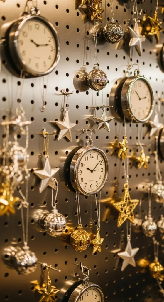 Create a horizontal countdown row using peg strips across the board. Assign each slot to a date leading up to New Year’s Eve. Add small printed countdown cards and clip a memorable photo under each. Use thin LED strip lighting along the top peg strip to give the display a soft glow. You can print the cards at home on matte cardstock for low cost. Add metallic confetti pieces in small mesh bags hanging from hooks for extra sparkle. This setup works well in entryways where guests can interact with the display quickly.