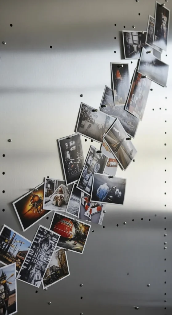 Go for a collage-style layout by layering photos in slightly overlapping rows. Use matte clips so the silver background stays visible. Keep the layers consistent so the board doesn’t feel messy. Add a small LED spotlight angled from the side for mild contrast. This setup works well when you have many photos and want a casual but sharp look.
