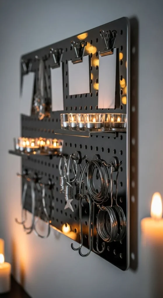 Add mini-shelves to create depth. Choose simple silver shelves shaped for pegboards, or attach adhesive-backed risers. Display New Year props like tiny clocks, candles, and glitter jars. Mix framed and unframed photos for variety. If you want a money-saving idea, cut scrap plywood, paint it silver, and add simple peg hooks to hold the shelf. Keep heavier items near the bottom. Use LED candles instead of real ones to avoid heat. This setup works great when you want the pegboard to feel like both décor and display.