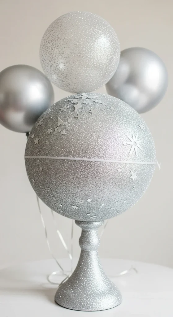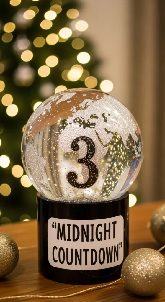 Place this countdown globe in the middle of a runner, or set one at each table group. Guests can gently shake it before midnight to watch glitter swirl around the year. Keep colors simple: metallic numbers, clear liquid, and silver or gold glitter so visibility stays high.