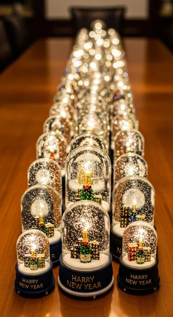 Instead of one large centerpiece, create a runner of snow globes. Use jars, domes, and glasses in different heights and widths, each with a simple scene: a tree, a star cluster, or a single figurine. Keep the materials consistent—similar glitter, similar color palette—so the runner feels cohesive.