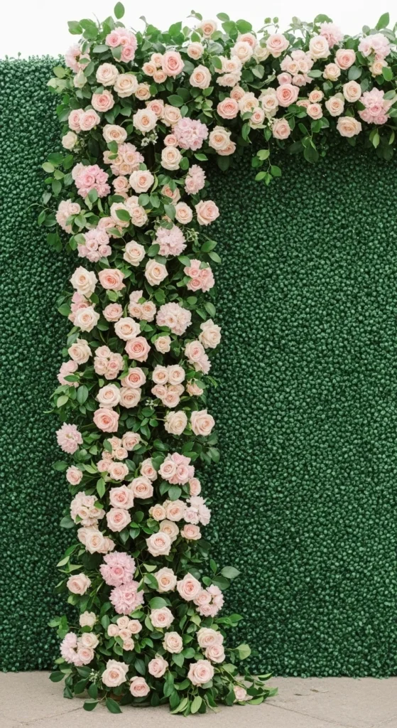 If hedge panels are pricey, cover cardboard or a fabric backdrop with artificial garlands instead. Use warm white spotlights angled upward from the floor to give the greenery depth. This style works well with black, cream, or blush outfits, and it looks great on camera. It’s especially helpful if your walls are busy or mismatched, as the hedge hides everything and creates a clean photo zone.