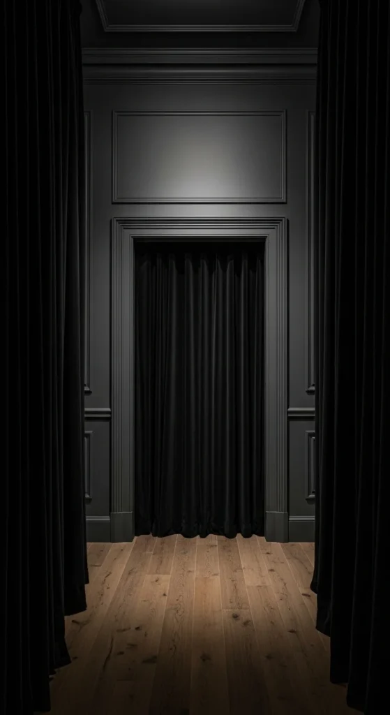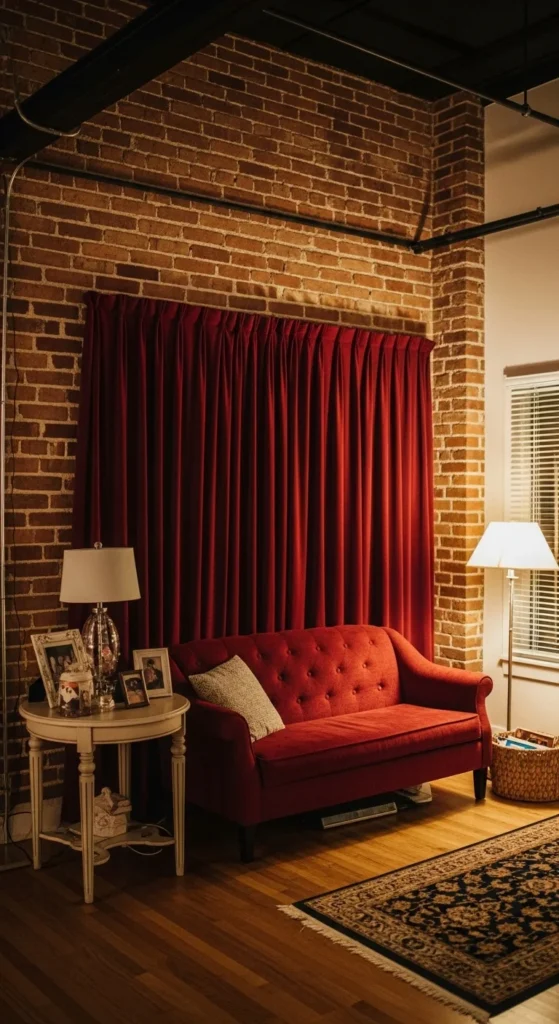 If you don’t have multiple mirrors, lean one full-length mirror against the wall and fill the sides with metallic curtain panels. To keep costs low, use stick-on mirrored squares mixed with foil board. Keep the rope color deep—burgundy or black velvet looks especially luxe here. Add low candles or LED lights at floor level so light bounces into the mirrors. This setup works well in small rooms because reflections make the space feel larger while still keeping that gala hallway look.