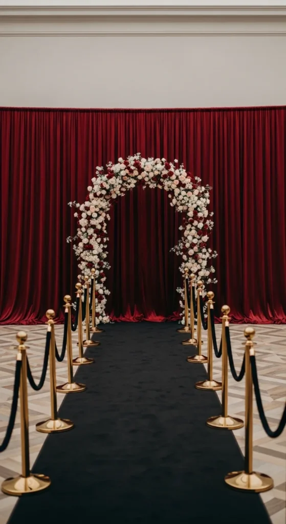 Guests walk through the rope path and end at the arch for photos. This helps with crowd flow and makes the backdrop feel like the main attraction. For a budget version, build posts from buckets, sand, and PVC pipes, then connect them with thick rope wrapped in red fabric. Keep the arch sturdy and secure so it doesn’t shift when people lean in. It’s especially helpful in open spaces where you want to guide people toward one main photo spot.