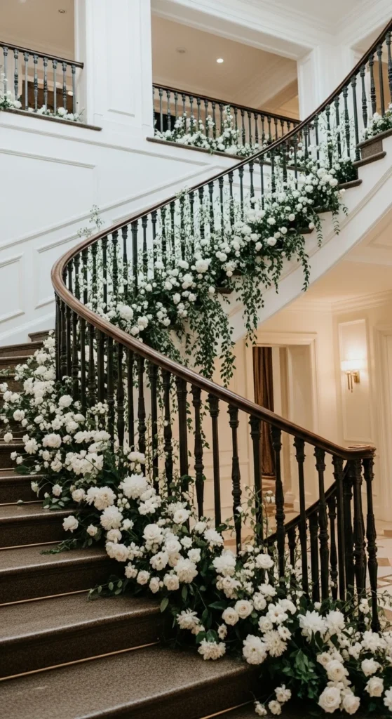 If your home or venue has a staircase, use the landing as a built-in stage. Hang a backdrop at the top or side wall—such as sequin curtains, greenery, or framed art prints—and run velvet ropes across the front of the landing, connected to the stair rail.