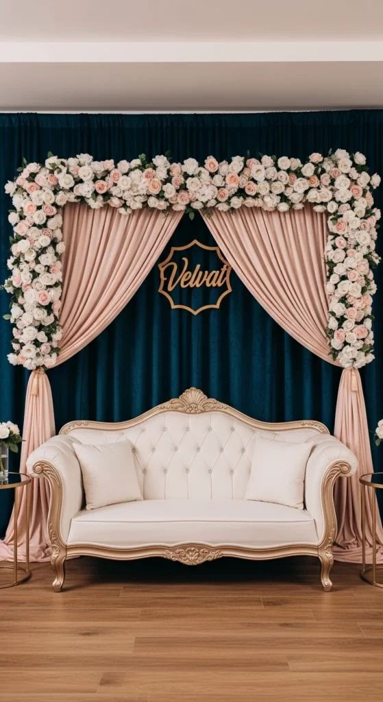 Set up a VIP sofa lounge as your photo backdrop. Place a low sofa or bench against a decorated wall—think layered frames, mirrors, or a curtain with a simple drape. Then rope off the front with velvet ropes on each side so the lounge looks like a reserved area.