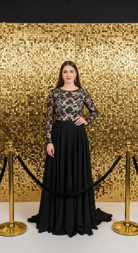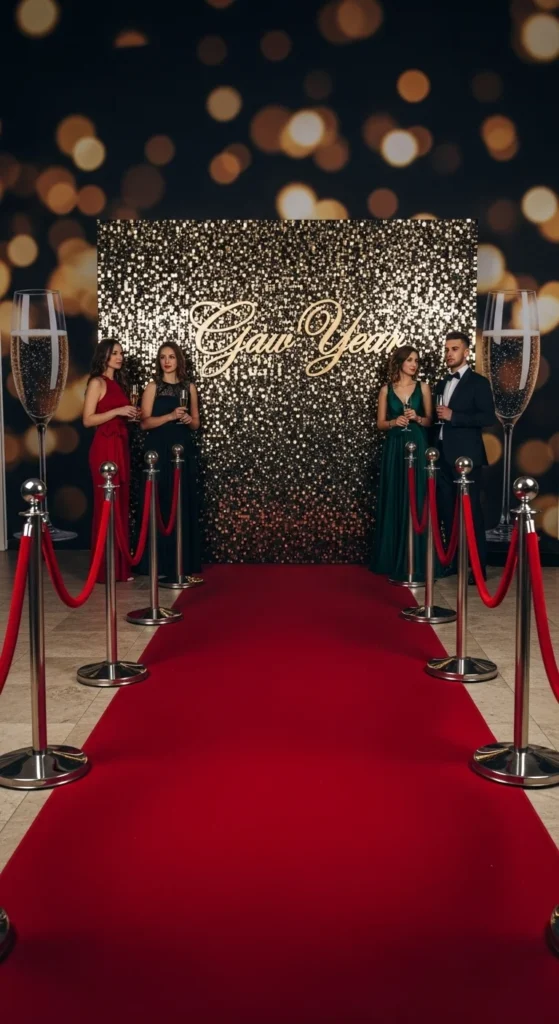 For a full-on gala-glow moment, combine a gold sequin backdrop with a double velvet rope runway. Hang sequin panels or a gold foil curtain across the photo wall. Extend a red or black runner from the wall into the room, then place two rows of velvet ropes—one on each side—to create a mini runway.