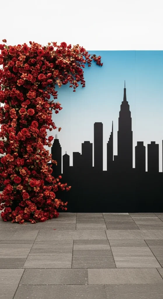 Use string lights or fairy lights above the skyline to mimic stars. For a low-cost approach, use cardboard boxes cut into building shapes and painted black. If you want extra detail, layer two skyline rows at slightly different depths. Invite guests to stand between the ropes with the skyline behind them, as if arriving at a rooftop gala. Keep floor clutter away so long dresses and suits stay clean and the focus stays on the silhouette story.