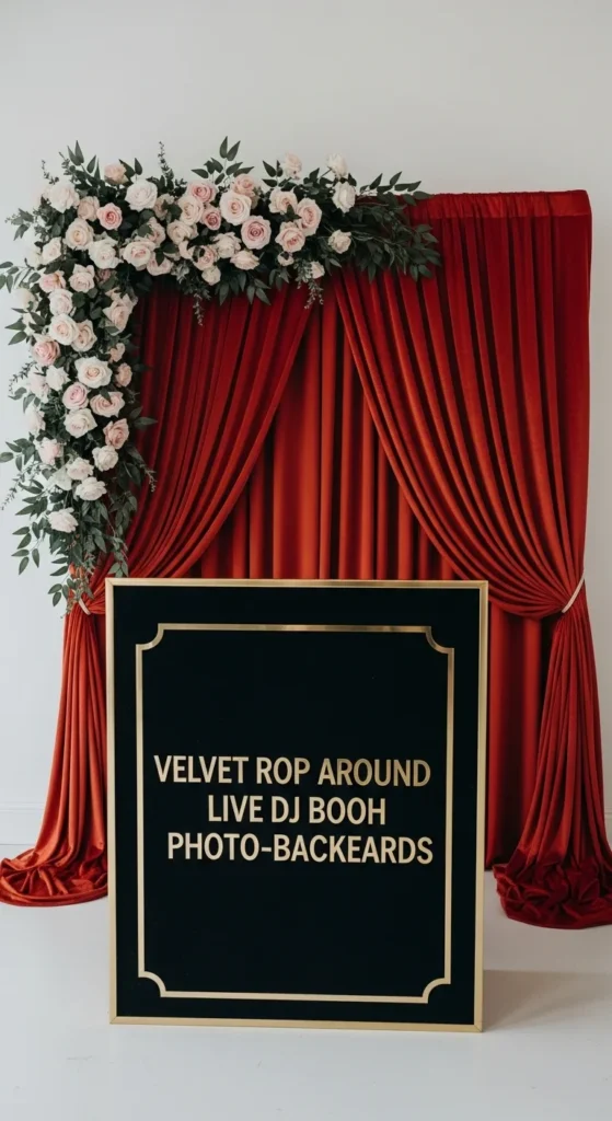 Use velvet ropes to separate the dance floor from a photo zone. Place your backdrop on one side of the room and run a short velvet-rope line between it and the dance area. Guests step under or around the rope to enter the photo corner, making it feel like a quiet pocket amid the music.