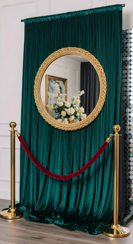 Use mirrors to create a glam reflection wall. Mount a cluster of tall mirrors or mirrored tiles on the backdrop wall, then place velvet ropes in a wide arc a few steps away. Guests stand inside the arc so the camera captures both them and shimmering reflections behind.