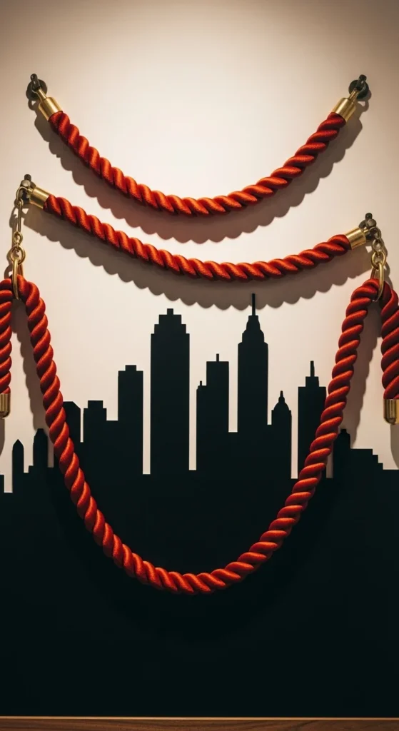 7. Velvet Rope Framing a City-Skyline Silhouette Wall