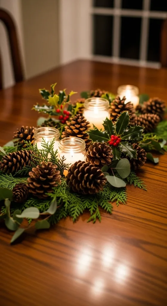 Gather pinecones, twigs, and a few sprigs of evergreen to build a natural centerpiece. Arrange them in a shallow wooden tray or bowl. Add candles for a gentle glow. You can collect pinecones from your yard or local park—a free and easy way to add texture. This simple display brings the forest indoors while keeping your table warm and inviting.