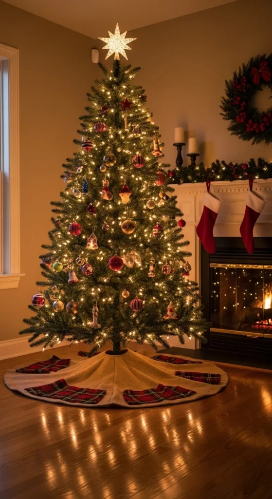 Trade shiny fabrics for burlap or plaid under your tree. You can make one by cutting a circle from fabric and fraying the edges. This simple skirt grounds your decor with rustic charm.