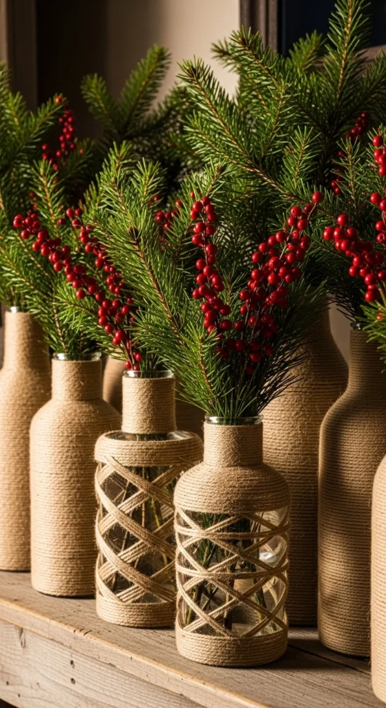Wrap old jars or vases with twine. Fill with evergreens or berries. This project costs almost nothing and looks stunning on tables or windowsills. It’s a great way to reuse what you already have.