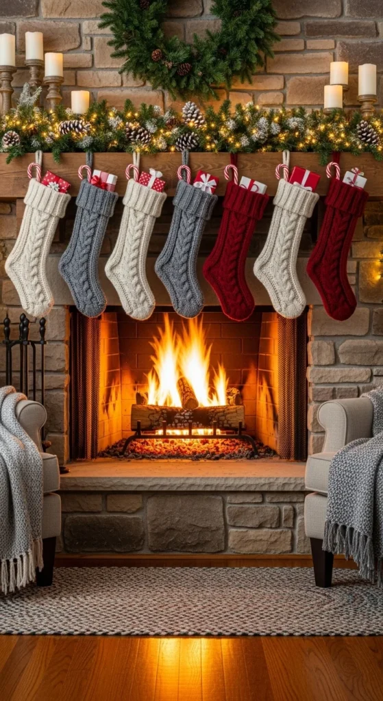Chunky knit stockings bring instant warmth. Choose neutral or plaid patterns. DIY: knit your own or use sweater sleeves. Hang them from your mantel for a soft, inviting display.