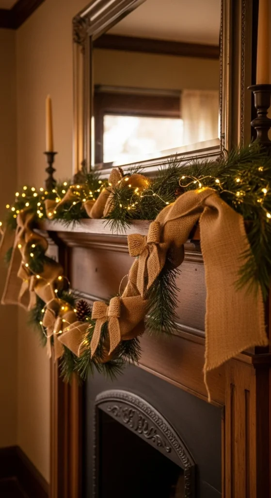 Burlap adds instant rustic charm. Cut long strips and twist them with twine or fairy lights. Hang across mantels, doorways, or stair rails. For extra texture, weave in small pine branches or cinnamon sticks. This DIY garland is affordable, reusable, and smells amazing when you add a hint of spice.