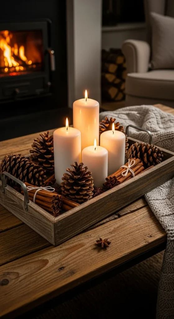 Arrange candles and natural accents on a wooden tray. Use mixed sizes and textures. This quick setup adds a cozy centerpiece to any table.
