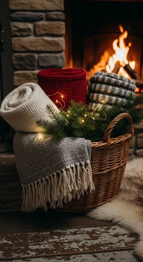 Fill baskets with plaid blankets, greenery, or lights. Place beside sofas or fireplaces. It’s both practical and decorative, adding texture and warmth.