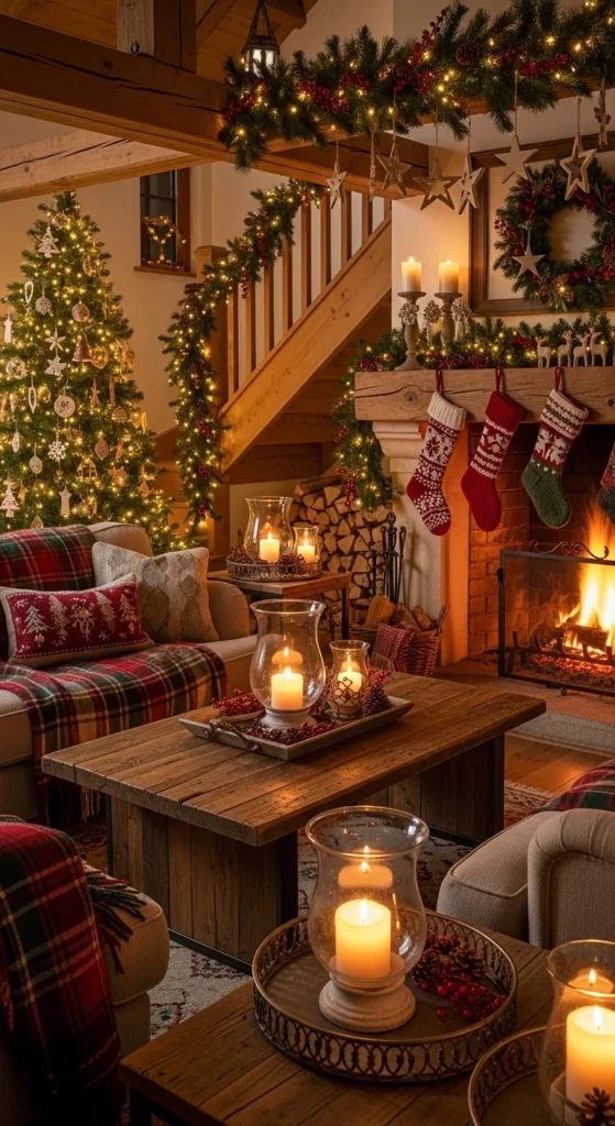 Layer plaid and chunky knit throws on sofas and chairs. Mix warm tones like red, brown, and cream. This creates a snug, cabin-like feel instantly. Tip: thrift stores often have affordable blankets perfect for this cozy setup.