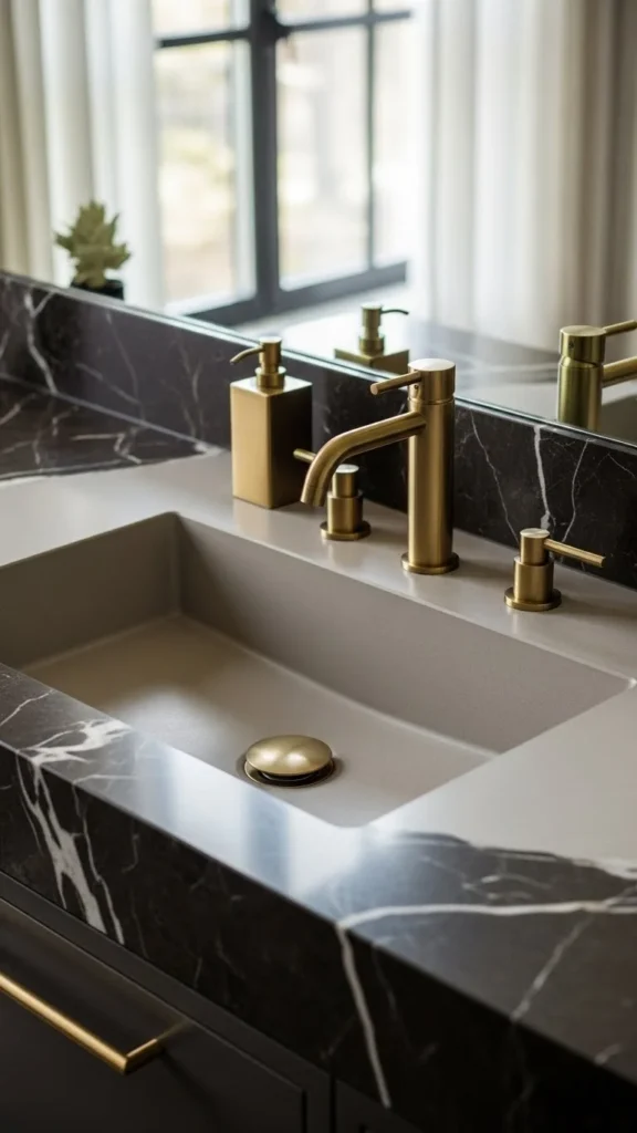 Matching finishes help bathrooms feel cohesive. Focus on towel bars, hooks, and faucets.