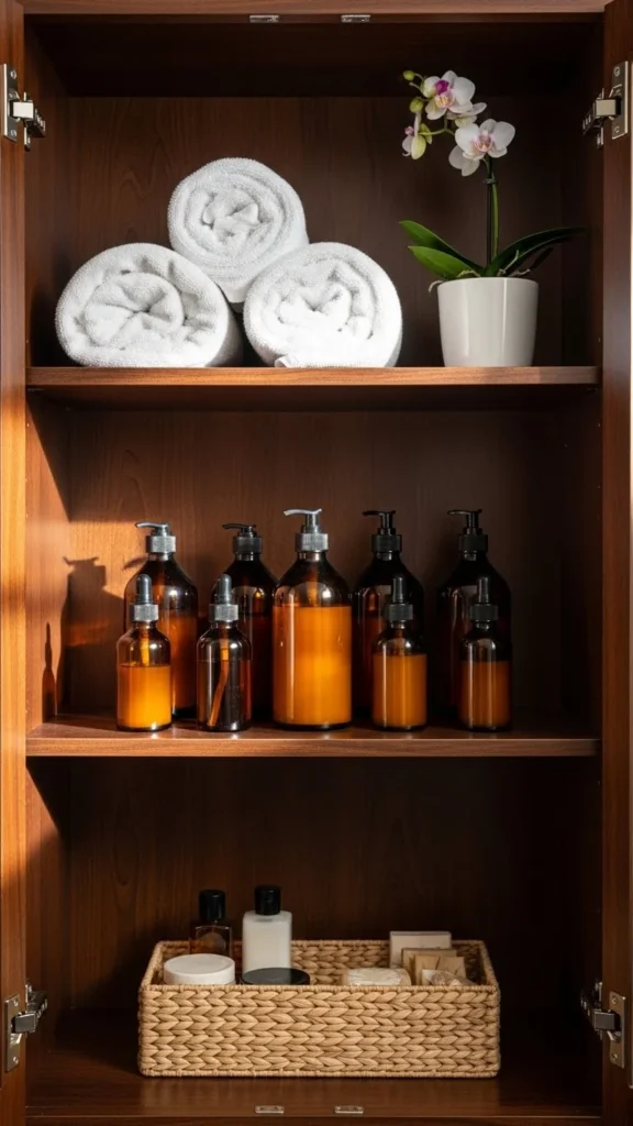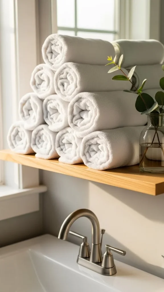 Rolled towels feel hotel-like and save space. Use this method on shelves or in baskets.