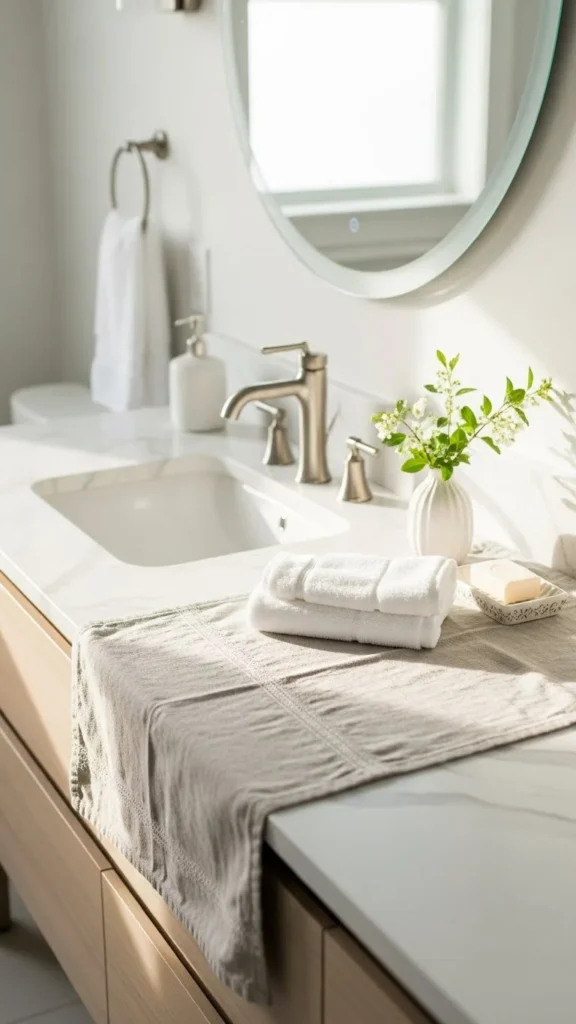 Hotel bathrooms keep counters mostly clear. Remove everything from your vanity and add back only daily-use items.