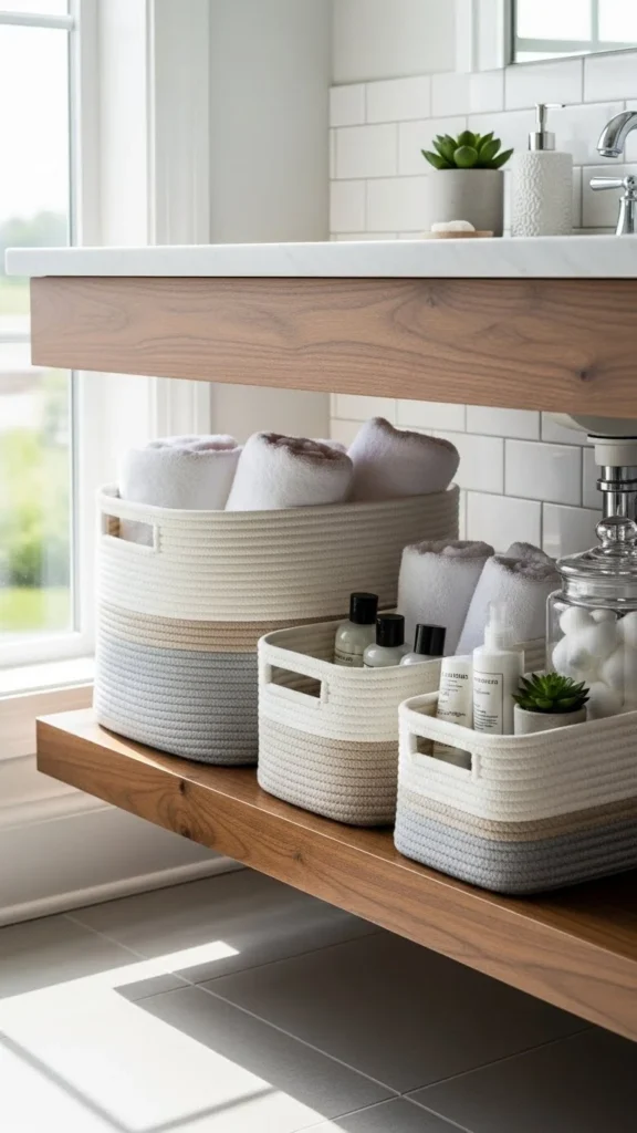 Matching baskets keep storage looking tidy. Use them under sinks or on shelves.