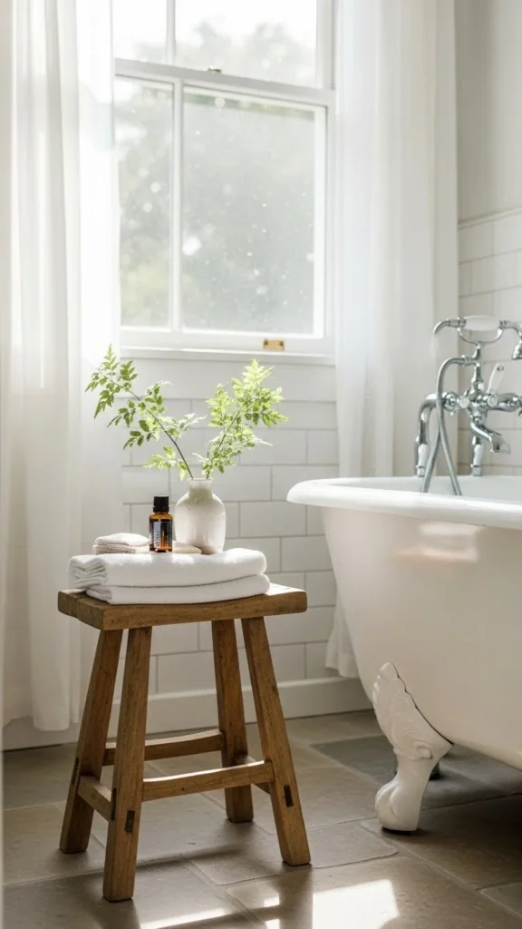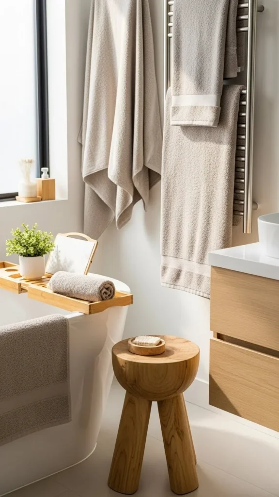 You don’t need many pieces. One or two accents are enough. Bamboo or beech works well in humid spaces.