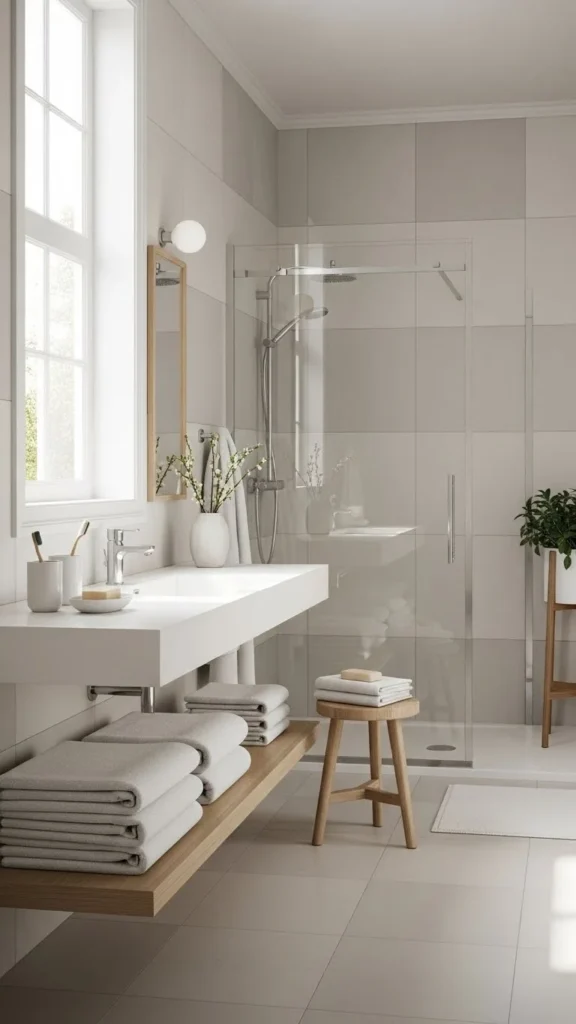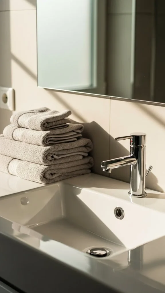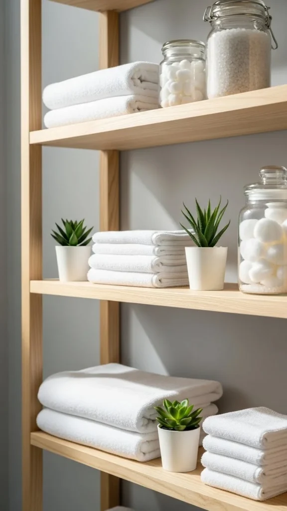 Fold towels neatly. Add one decorative object at most. Avoid filling every shelf.