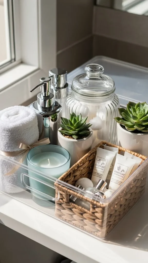 Use a small tray to group soap, lotion, or skincare. This keeps things contained and easy to clean around. Avoid too many bottles or mixed colors.