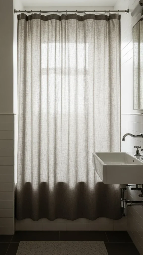 A simple shower curtain changes the entire room. Choose fabric over plastic for a softer look. White, cream, or light gray works well.