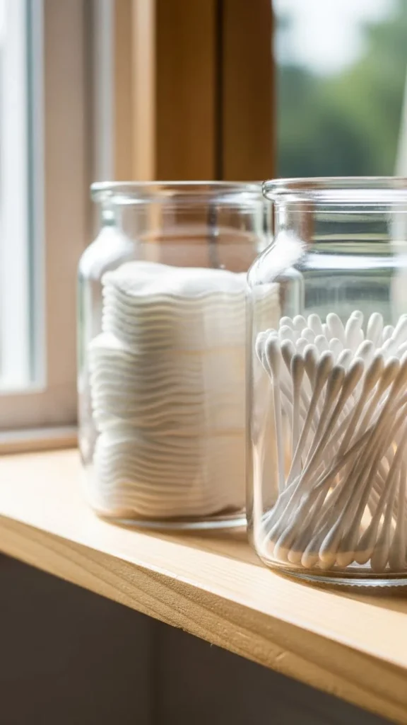 Clear jars make small items look tidy. Use them for cotton pads, swabs, or bath salts.