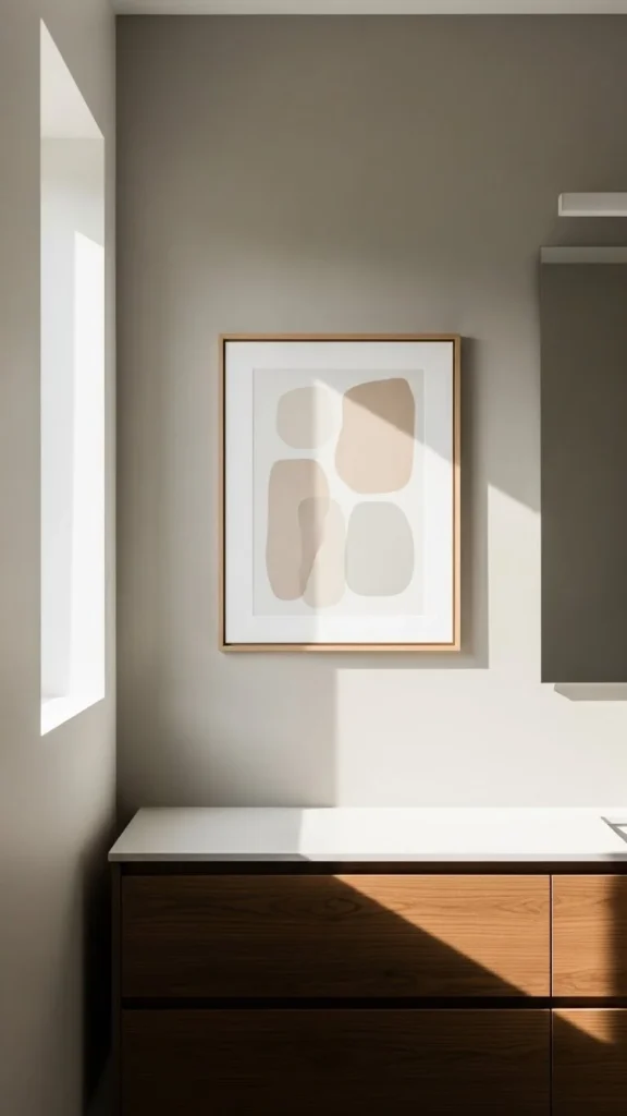 One or two frames are enough. Quiet wall decor suits bathrooms best.