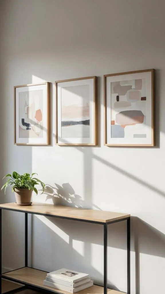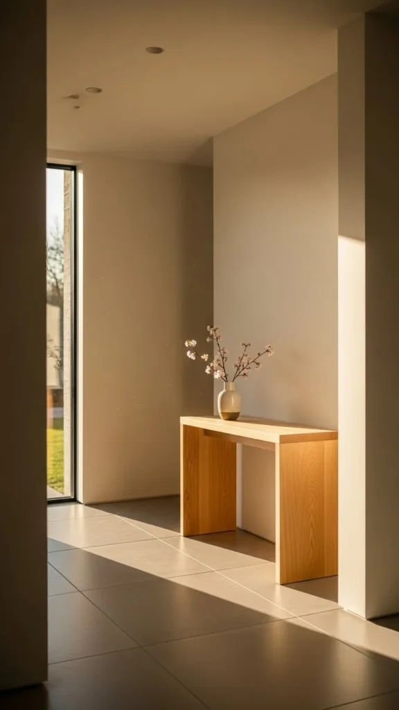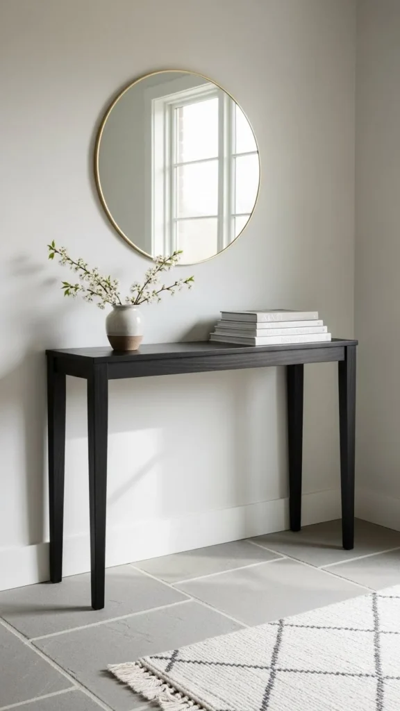 A slim console table adds function without crowding the space. Choose a narrow design that leaves walking room clear. Light wood or painted finishes help keep the area feeling open.