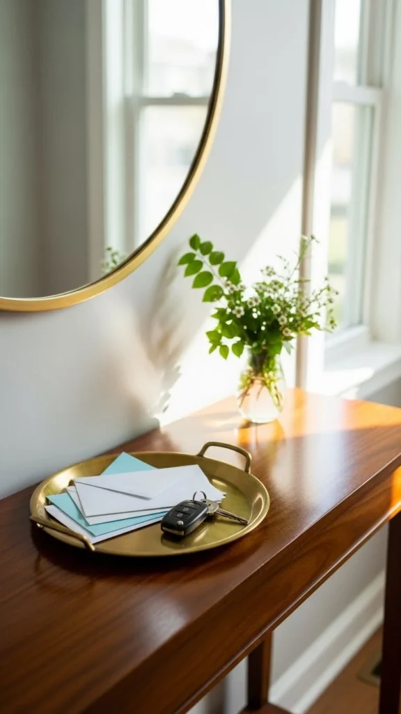 If space is tight, wall-mounted consoles work well. Clean console styling gives you a landing spot without visual clutter.