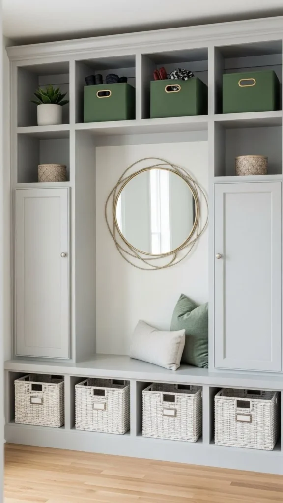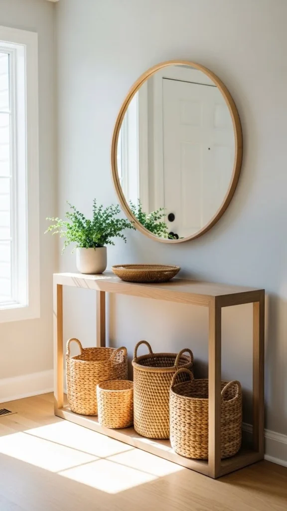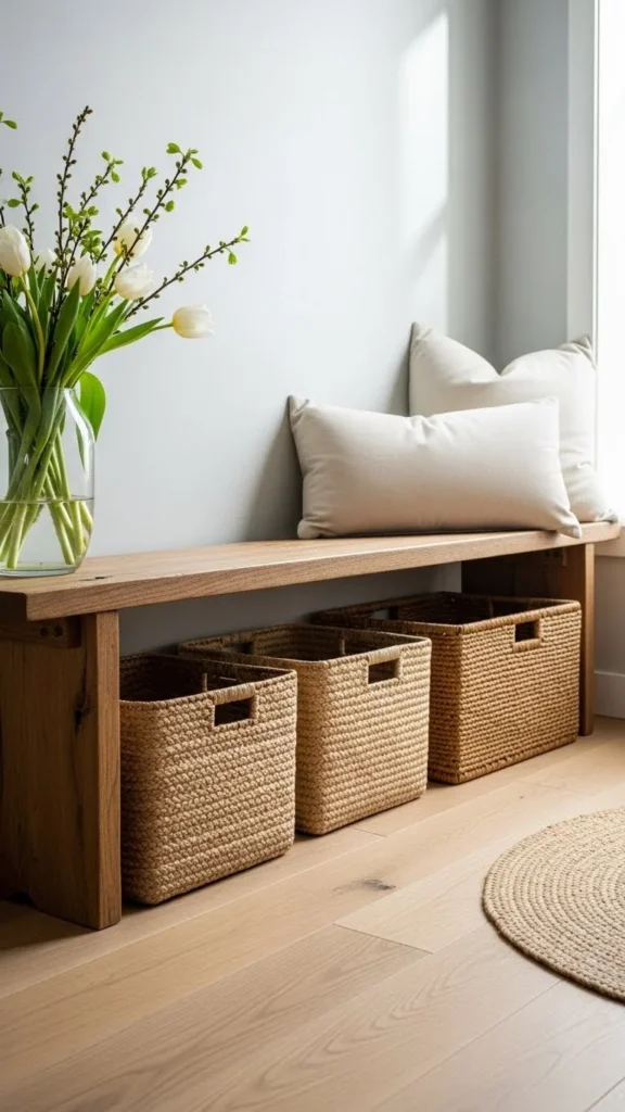 Slide baskets under benches or consoles to save space. Hidden storage keeps the entry tidy without effort.