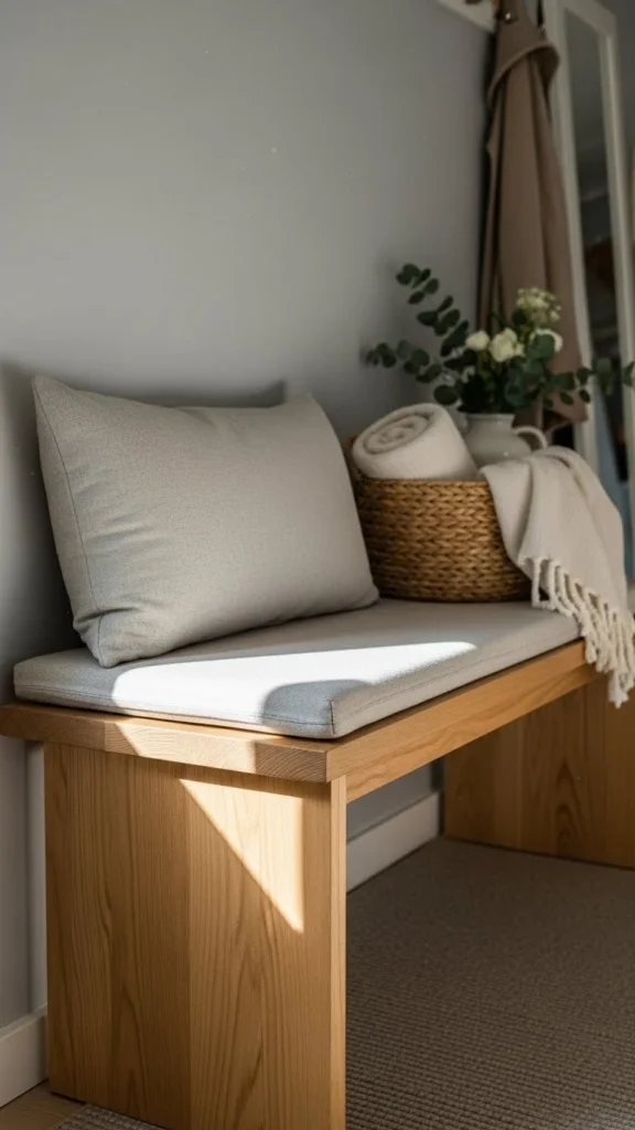 If buying new isn’t possible, repurpose a small bench from another room. Dual-purpose furniture works well in entryways.