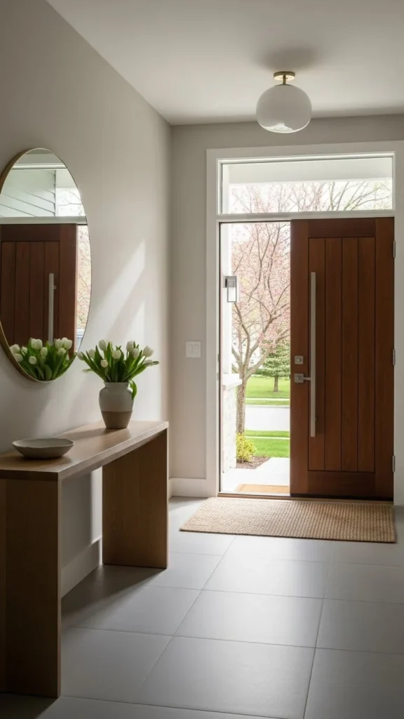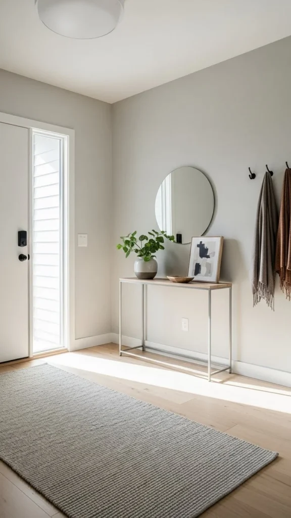 Light wall colors reflect daylight and help entryways feel more open. Soft beige, warm white, or pale gray work well.