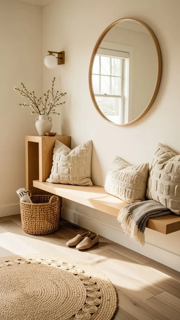 Light wood accents soften the entry. Use trays, stools, or frames.