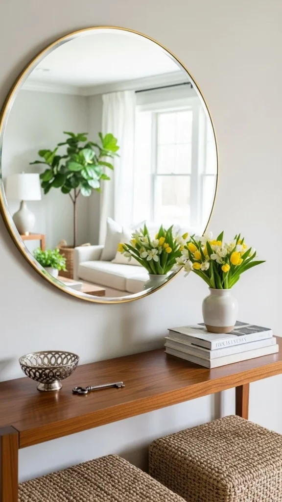 Hang mirrors at eye level and keep frames simple. Reflective surfaces help the entry feel brighter.