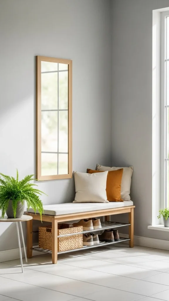 A shoe bench adds seating and storage. Light wood styles feel less bulky than dark finishes.