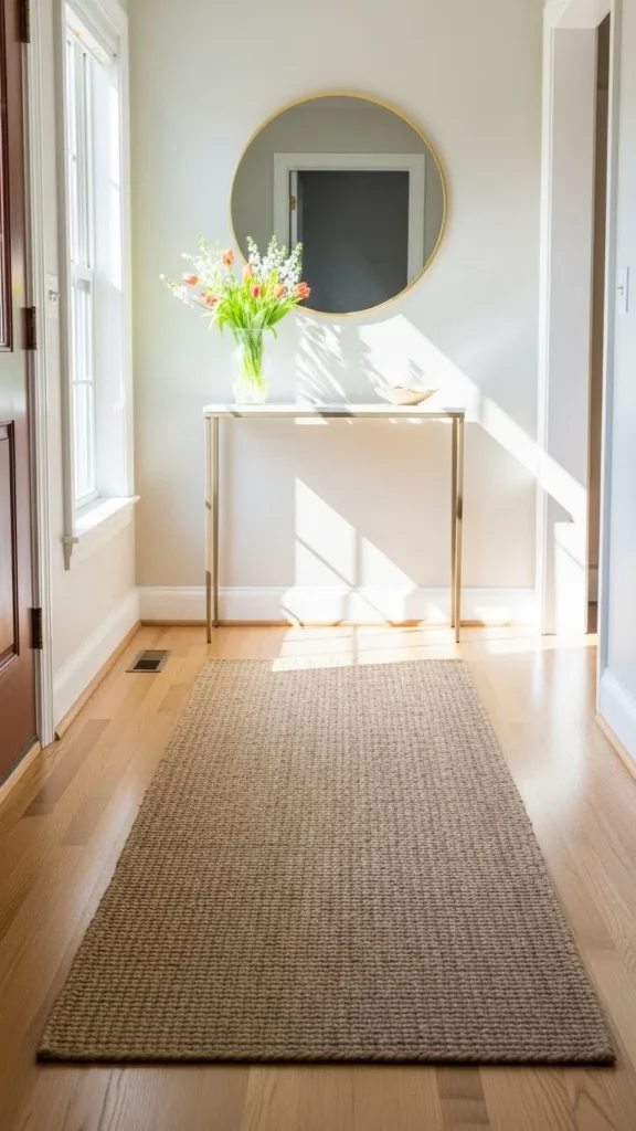 Make sure the rug fits the space properly. Soft floor layers help the entry feel finished.